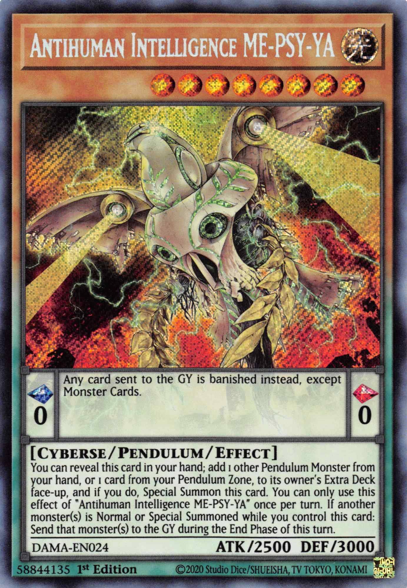 You can reveal this card in your hand; add 1 other Pendulum Monster from your hand, or 1 card from your Pendulum Zone, to its owner's Extra Deck face-up, and if you do, Special Summon this card. You can only use this effect of "Antihuman Intelligence ME-PSY-YA" once per turn. If another monster(s) is Normal or Special Summoned while you control this card: Send that monster(s) to the GY during the End Phase of this turn.