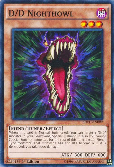 When this card is Normal Summoned: You can target 1 "D/D" monster in your Graveyard; Special Summon it, also you cannot Special Summon monsters for the rest of this turn, except Fiend-Type monsters. That monster's ATK and DEF become 0. If it is destroyed, you take 1000 damage.
